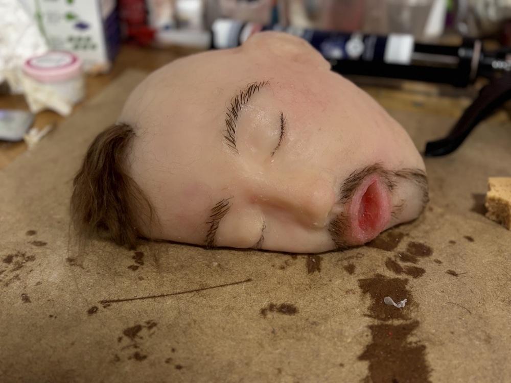 Once demoulded, I refine the surface by trimming, patching, and smoothing, paying close attention to seams and transitions so the surface remains uninterrupted and bodily. Hair is then individually punched into the silicone, a slow, meditative process that can take several days and contributes to the intimacy of the work.