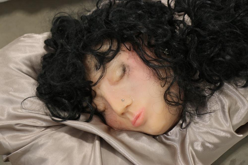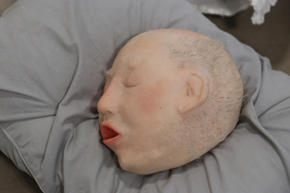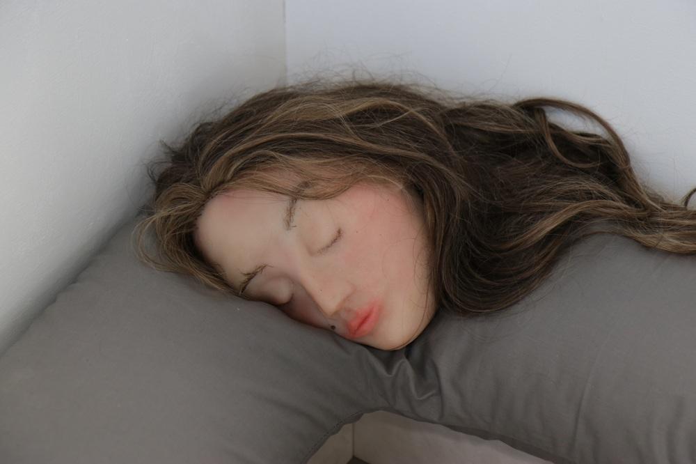 Finally, the head is carefully positioned on their pillow, completing the work as both an object and a presence.