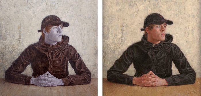 René Tweehuysen, side by side: Finn (Underpainting) and Finn (Completed painting on show at BP Portrait Award)