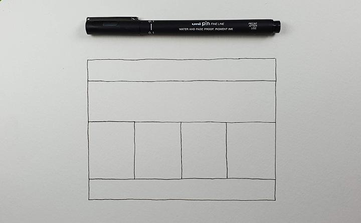 Start by creating a grid that divides our row of colourful houses into Roof, 1st Floor, Ground Floor, and Pavement. Create vertical divides the houses into 4 separate