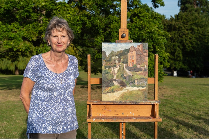 Thank you Cass Art! It was a wonderful day, weather-wise, so although it was very hot, we didn't have wind or rain to contend with, so that was a bonus. It was an early start so it felt like quite an adventure getting up and setting off for Kent, and when we arrived at Chartwell, the wonderful team at Storyvault Films were very organised and we were quickly set up and ready to start. Although we were painting most of the time, it was good in the breaks to have the chance to talk to the other artists - we all had such different back-stories, it was really interesting finding out about them. I don't think you really get used to answering all the questions in front of a camera, while also trying to produce something reasonable at the end of the four hours, but actually, having to break off and stand back occasionally is very helpful in terms of seeing where to go next, or what could be going wrong.