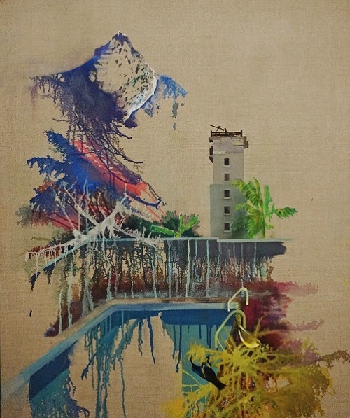This piece is from early 2009, it started from a drawing is which is unusual for me. It was from a sketch I did whilst on holiday in Sri Lanka. It’s a swimming pool beside the hotel with an army outlook post in the distance. I just happened to be there during the war and they were driving all the Tamils up to the North. So the vibrant colours and playful use of paint work in contrast to the sombre subject.