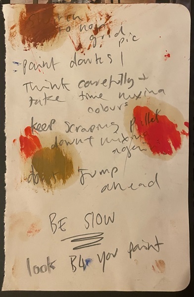 I paint on an orange ground for a number of reasons, I find it easier to mix colours correctly when working on a mid-tone surface, as it contextualises the colours more accurately. In addition, it allows me to be more sparing with my brushstrokes, as I can leave sections untouched and it doesn’t jump out to the eye. Laying down the underpainting with the board upside down was actually something I only began doing in the lead up to the show, to make up for the lack of time that I would usually spend labouring over proportions, however, I found it so useful that I have continued to do it since then. After I have the underpainting in, I work dark to light, which I found difficult in the heat as Yungblud was so well lit, there wasn’t much contrast on his face. Instead, I emphasised the cooler shades to create that contrast myself. I try not to go back over sections of my painting, instead working slowly and thoughtfully, which was hard to do under so much stress. Below is a photo of my notebook that I had on the table as I was painting, so that I didn’t completely forget how to paint.