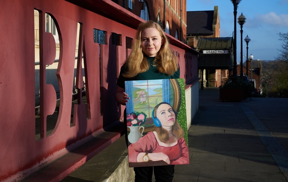 In my painting, there is a woman in the background in place of Lancelot, picking the same flowers you see in the vase, which creates a link between her and myself. There are oak leaves and acorns stencilled onto the wallpaper of the room I’m in, representing the confinement of tradition. The time on my watch shows just after midnight to match with the idea of magic and curses that appear in the poem, while the headphones tie the painting to the present day and tell a bit about me (I’m always listening to music so I can become even more lost in my thoughts). Additionally, the colour palette is in keeping with that of Waterhouse’s painting ‘I Am Half-sick of Shadows, Said The Lady of Shalott’ (1915), but also happens to consist of my own favourite colours.